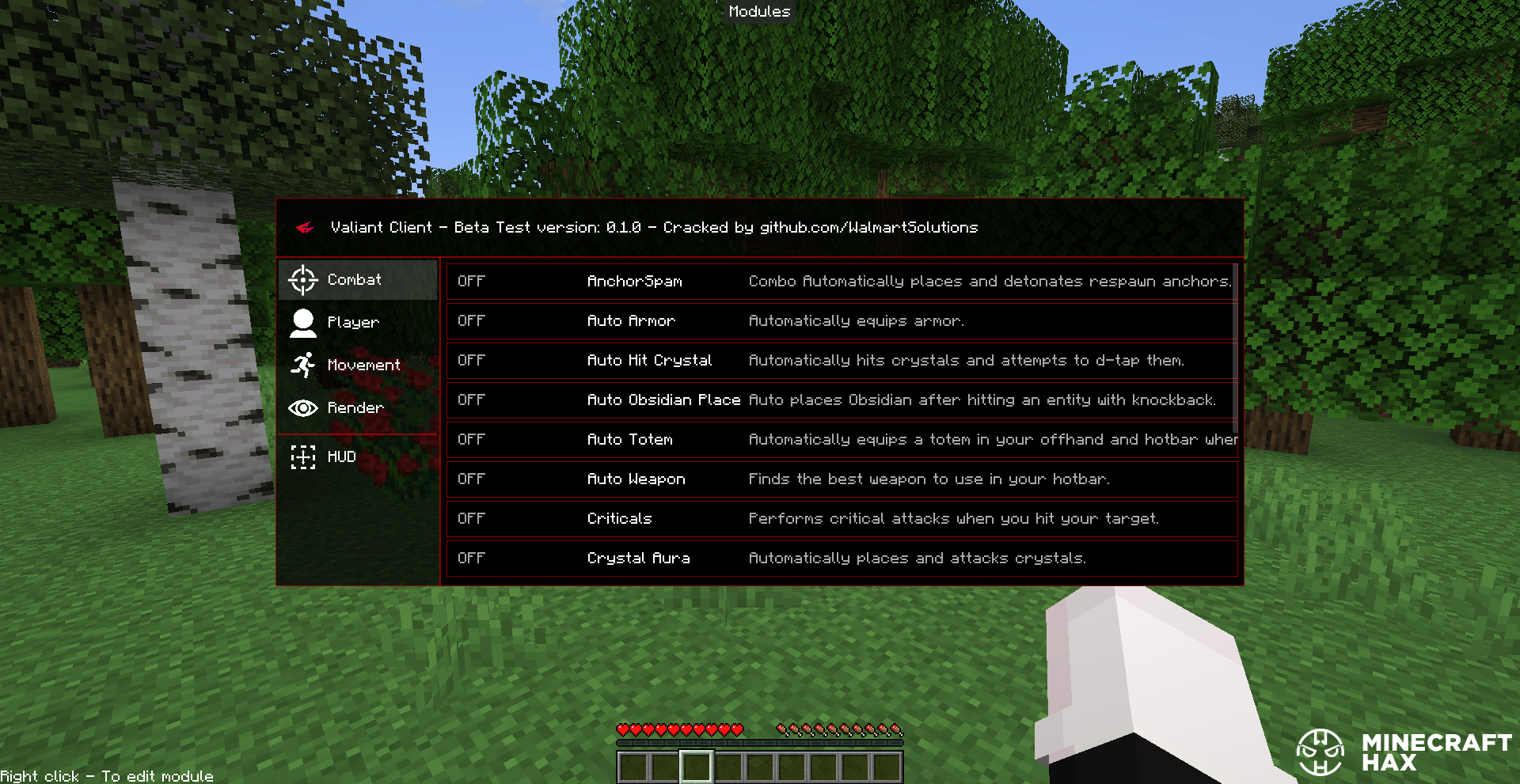 Hacked client Valiant is one of the most balanced and powerful hack clients for Minecraft, perfectly suited for Crystal PvP. It combines convenience, stability, and advanced functionality, turning the player into a true arena fighter. If you are looking for a client that brings control, defense, and aggression together in one interface, Valiant is an excellent choice.