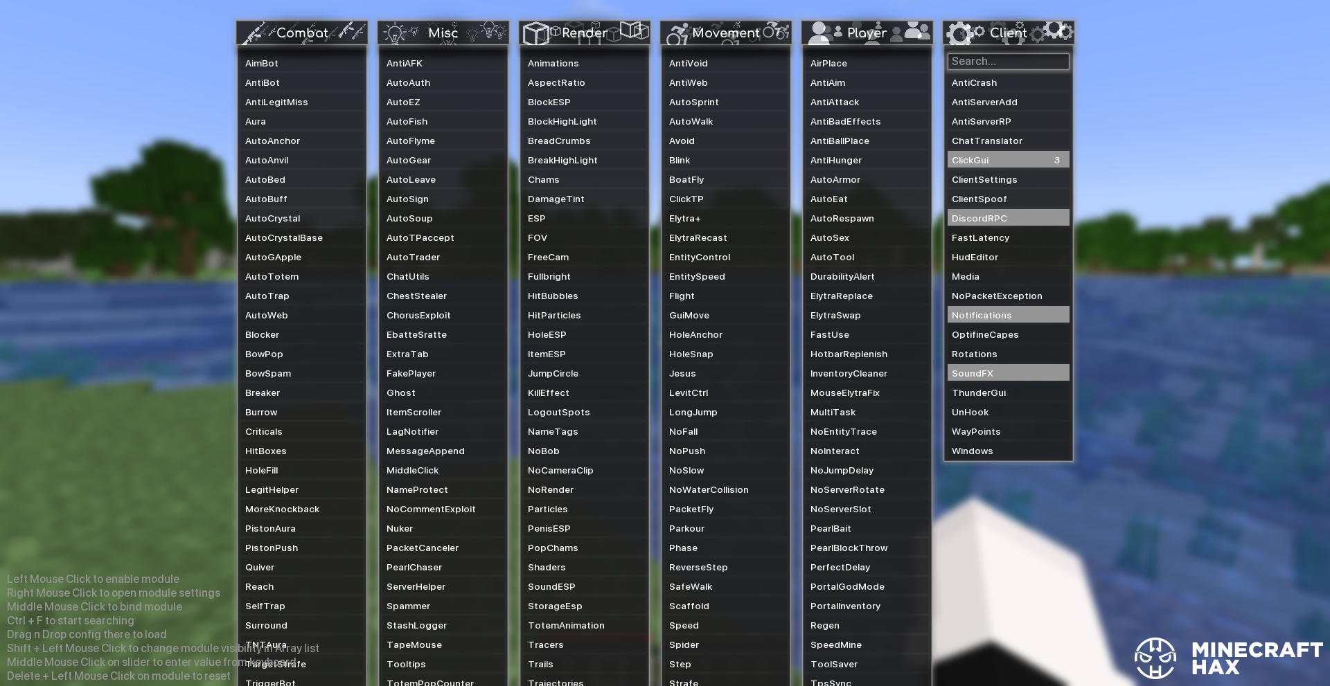 The ClickGUI is easy to customize, categories are logically structured, and modules can be quickly enabled and configured. Smooth animations and customizable colors allow users to tailor the appearance to their personal preferences, making the client not only effective but also visually pleasing.