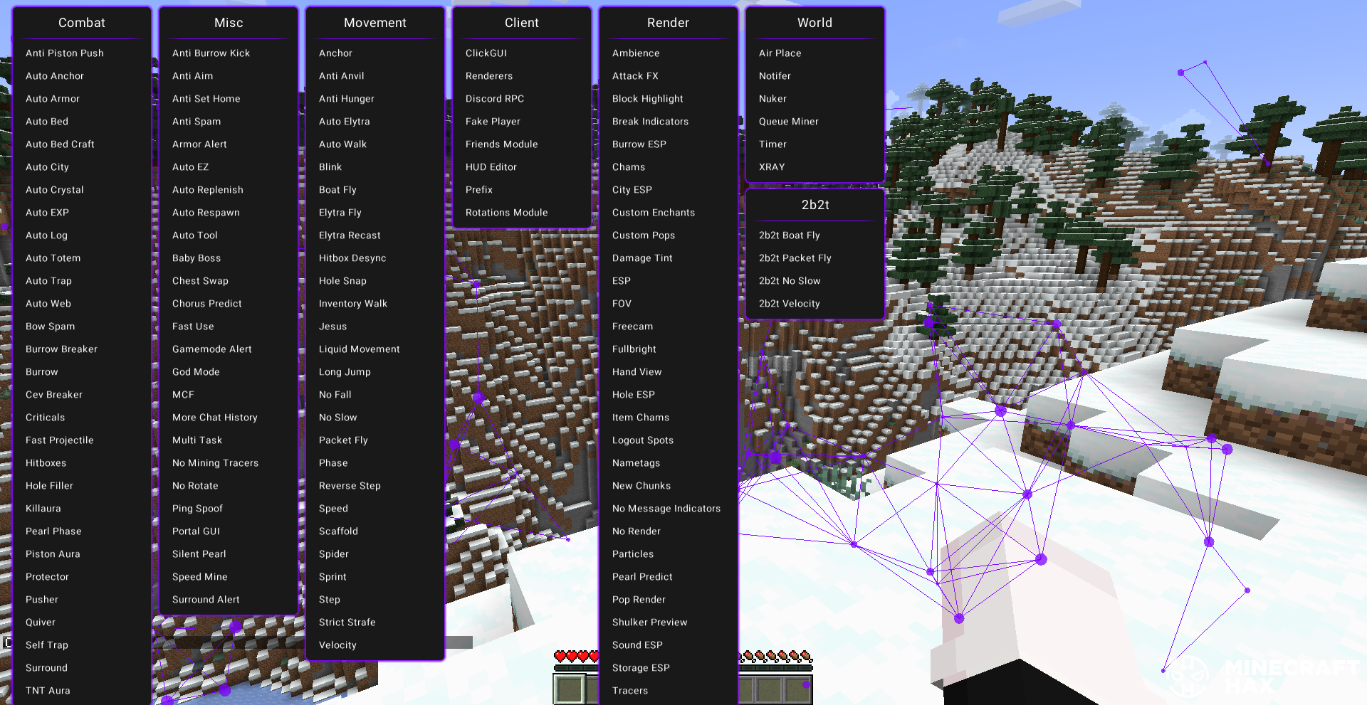 The client includes advanced tools for automating PvP combat. These features help effectively attack opponents, utilize explosive mechanics, and optimize combat even on servers with strict anti-cheat systems. Nearly all combat features offer fine-tuned settings, allowing them to be adapted to specific servers.