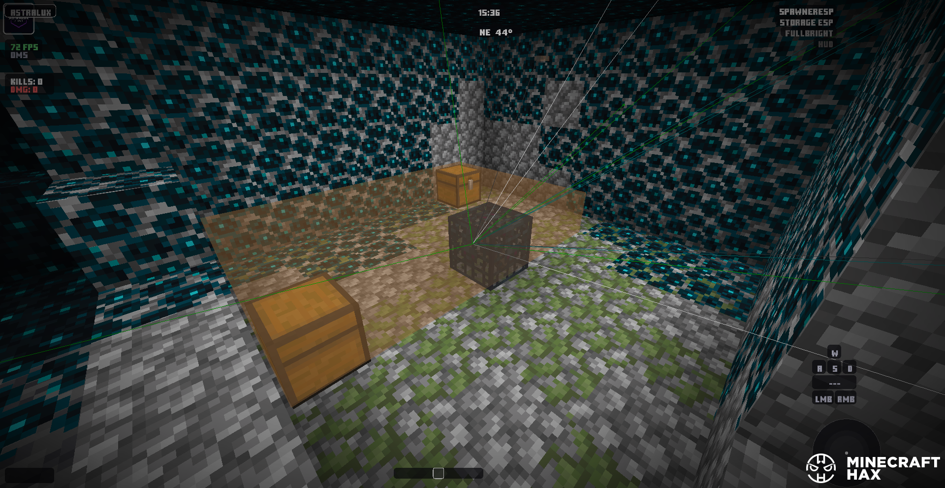 To enhance situational awareness, Astralux improves the game’s visual clarity. The client highlights players, chests, spawners, and important blocks, while also increasing visibility through higher brightness levels, fog removal, and name tag rendering. This helps players navigate environments faster and spot potential threats in advance.