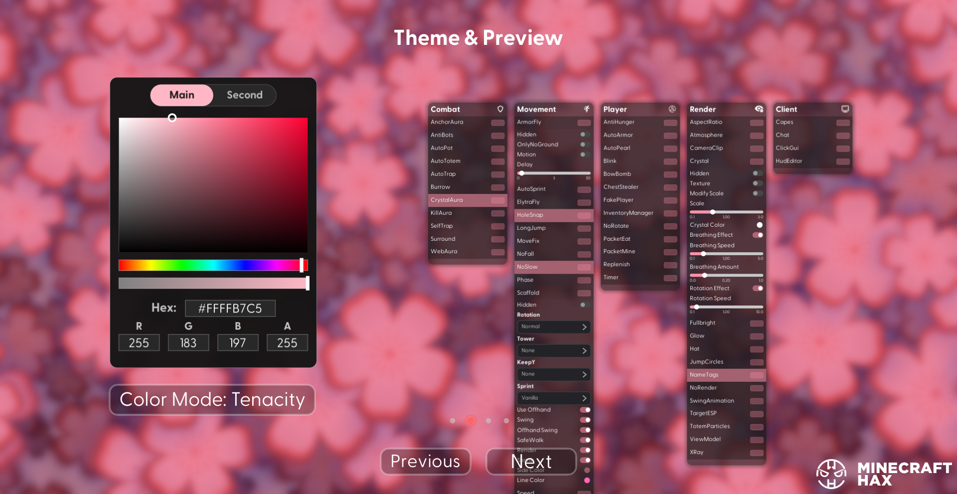 Sakura 6 is a multifunctional modular hacked client that significantly expands the standard capabilities of Minecraft. It automates key processes, simplifies combat, and gives the player a visual advantage through advanced rendering tools.